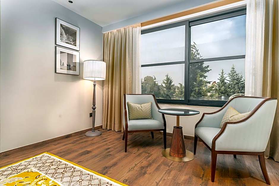 The suite features a tea and coffee maker and garden views.